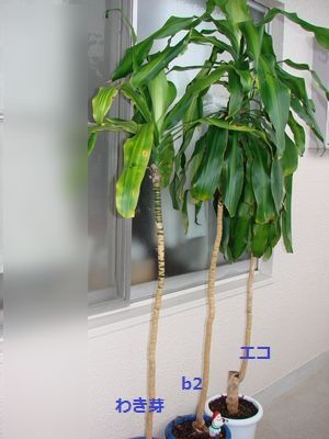 わき芽のエコちゃんとb2の葉がダメージを受けています・・・。 多分、昨年せっせと肥料をやり過ぎた、肥料過多によるものと思われます。 (@@;; 本日植え替え、葉をカット。 「土」は 花と野菜の土1袋+赤玉土小1袋 、「肥料」昨年の残り チッソ:リン酸:カリ=8:8:8 実生株・エコちゃんと同じ土。 |