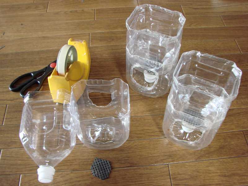 5/20 ペットボトルをカットし、切り口にテープをはります。底にはネットを入れます。 |